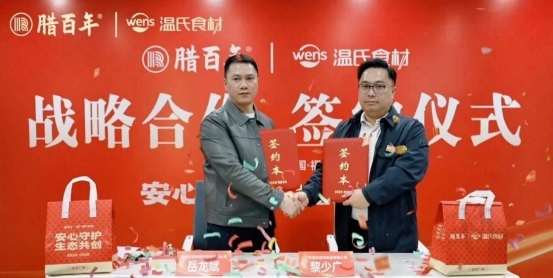近日,国内知名餐饮连锁管理公司好百年(旗下核心品牌“腊百年”)与农牧行业龙头温氏集团的联名合作签约仪式于福州隆重举行。好百年集团董事长岳龙斌、温氏集团鸡业一部助理总裁黎少广等双方核心高层齐聚现场,共同完成合作协议签署。